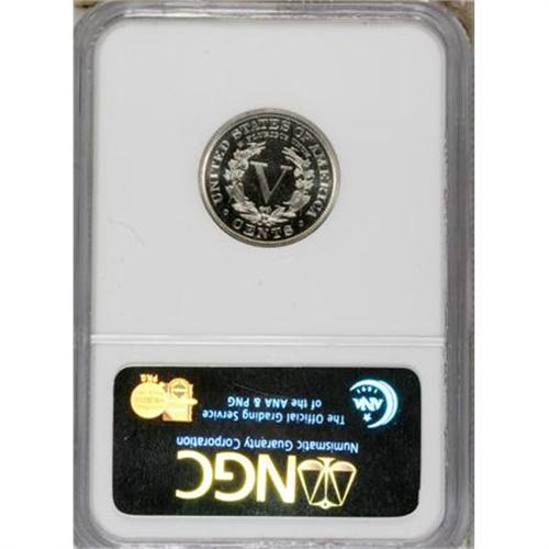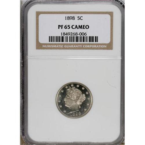 <B>1898 5C PR65 Cameo NGC.</B></I> The legends and devices are evenly frosted, unlike some pieces seen with less frost on the face and neck of Liberty. The strike is needle-sharp, and only a whisper of carbon limits the grade. Census: 14 in 65 Cameo, 18 finer (5/07).<BR><BR><b>Shipping:</b> Coins & Currency (<a target="_blank" href="http://www.heritageauctions.com/common/shipping.php">view shipping information</a>)
