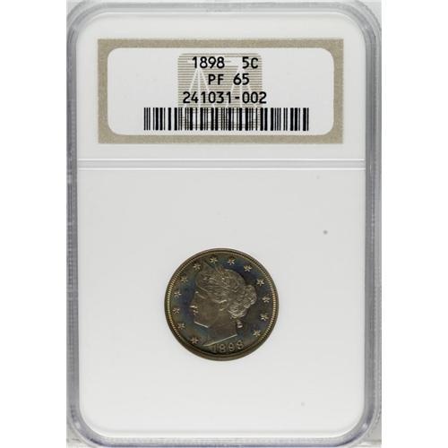 <B>1898 5C PR65 NGC.</B></I> Sharply struck with dramatic, watery reflectivity in the fields and lovely lime-green, olive, gold, and rose toning over both sides. Carefully preserved and free of distractions.<BR><BR><b>Shipping:</b> Coins & Currency (<a target="_blank" href="http://www.heritageauctions.com/common/shipping.php">view shipping information</a>)