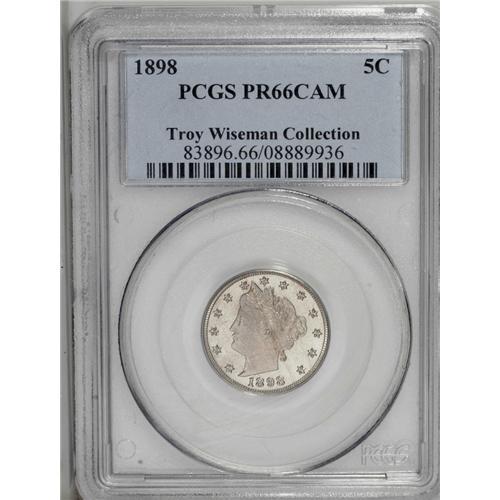 <B>1898<5C> PR66 Cameo PCGS.</B></I> Quite reflective with great contrast between the golden-toned fields and solidly struck devices. Population: 10 in 66 Cameo, 3 finer (8/06).<BR><I>From The Troy Wiseman Collection.</B></I>