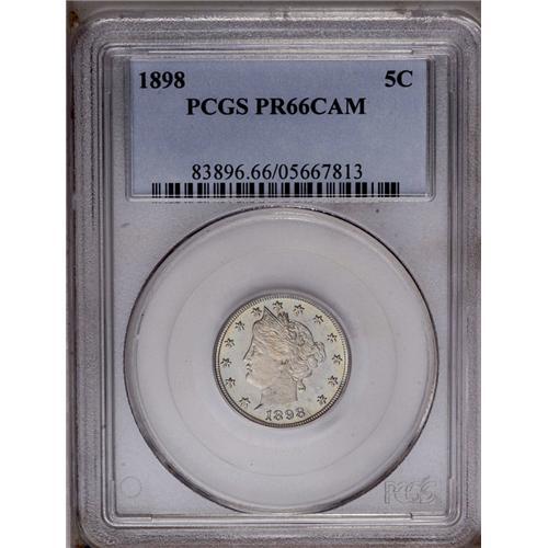 <B>1898<5C> PR66 Cameo PCGS.</B></I> Fully struck and impeccably preserved, with dark, reflective fields and mildly frosted devices. A visually enticing representative of this proof issue. Population: 9 in 66 Cameo, 3 finer (4/06).