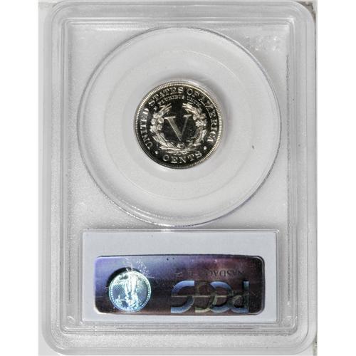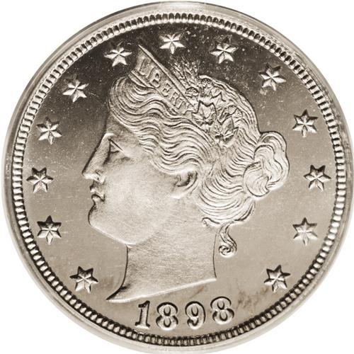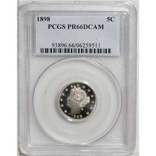 <B>1898<5C> PR66 Deep Cameo PCGS.</B></I> An almost fully struck example of this proof emission, one of 1,795 pieces produced in this year. The heavily frosted devices provide stark contrast with the brilliant mirrored silver-white fields. This lovely piece grades "only" PR66 likely because of some undistracting and microscopic dark specks that are visible solely with a loupe, but despite those minutiae, the eye appeal of this pretty coin is extremely high-end. This is the only PR66 Deep Cameo example certified at PCGS (7/06). NGC has certified just two pieces as PR66 Ultra Cameo with none finer.<BR><I>From The Troy Wiseman Collection.</B></I>
