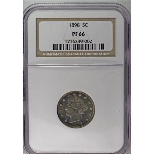 <B>1898<5C> PR66 NGC.</B></I> The deeply reflective surfaces are enhanced by grayish-gold toning on each side. A sharply defined and attractive Premium Gem. Census: 42 in 66, 9 finer (8/06).