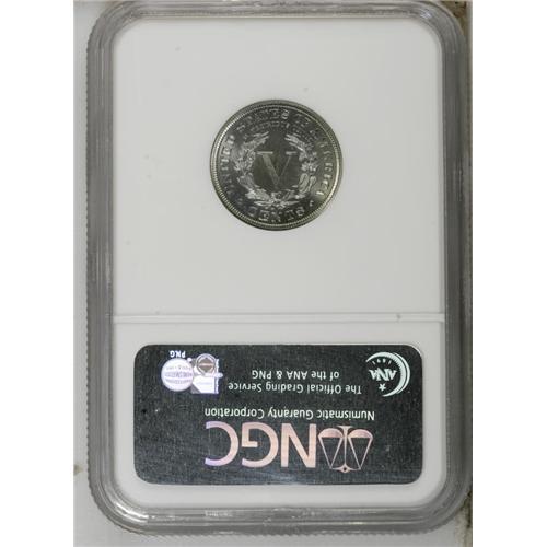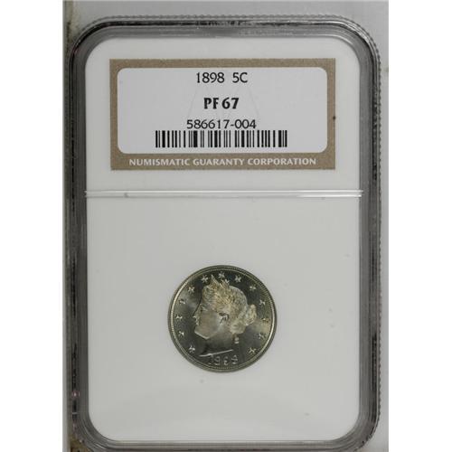 <B>1898 5C PR67 NGC.</B></I> A splendid specimen with fantastic eye appeal. Intensely reflective, with areas of light golden, green and yellow toning that enhance the brilliance of this piece. A few light carbon specks are noted in the right obverse field. Census: 8 in 67, 1 finer (10/06).<BR><BR><b>Shipping:</b> Coin/Currency (<a target="_blank" href="http://www.heritageauctions.com/common/shipping.php">view shipping information</a>)