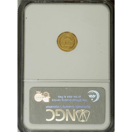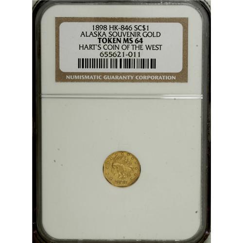 <B>1898 Alaska Gold One Pinch MS64 NGC.</B></I> AK HK-843 Indian head left, 13 stars. Believed scarcer than the Indian left, 16 stars variety (HK-844). A well struck and unblemished near-Gem that shows light clashmarks from the wreath about the Indian. Misattributed as HK-846 by NGC, which is an 1899-dated variety.<BR><BR><b>Shipping:</b> Coin/Currency (<a target="_blank" href="http://www.heritageauctions.com/common/shipping.php">view shipping information</a>)