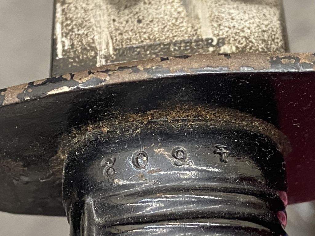 Condition: Signs of age and wear include surface scratches, scuffing, oxidation, chipping to paint, and pitting. Scabbard shows wear and age including denting and chipping.