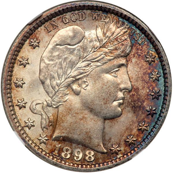 1898. NGC graded MS-64. Well struck with a blending of gold, violet and electric blue toning on portions of the obverse.