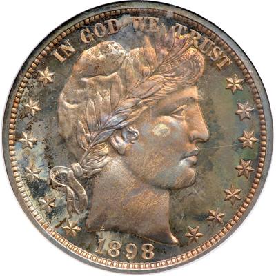1898 Barber Half Dollar. NGC graded Proof 67. Only 735 pieces struck. The specimen in this lot is one of fewer than two dozen Proof 1897 so graded by NGC. Furthermore, it's high rank is improved by the technical quality and eye appeal for the Barber Type, this coin exhibits sharply struck devices that are dripping with thick, rich mint frost. Virtually perfect in every way, with pristine surfaces and some hardy toning across the fields and devices. Outstanding! Pop 22; 10 finer in 68.