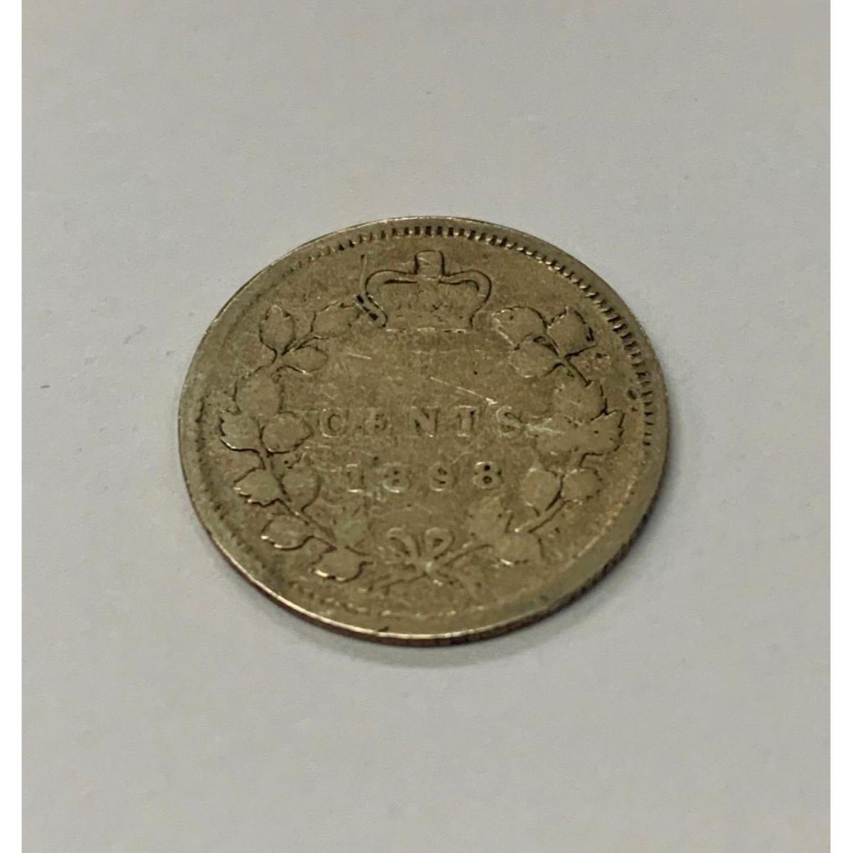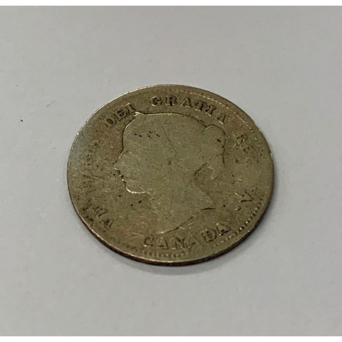 Obverse The portrait in left profile of Victoria is surrounded with the inscriptions "CANADA" and "VICTORIA DEI GRATIA REGINA" (Victoria, Queen by the grace of God) Lettering:  VICTORIA DEI GRATIA REGINA. CANADA Reverse The facial value is surrounded with two maple boughs and the crown of Queen Victoria Lettering:  5 CENTS 1858 Features  TypeStandard circulation coin Years1858-1901 Value5 Cents (0.05 CAD) MetalSilver (.925) Weight1.167 g Diameter15.494 mm Thickness0.70 mm ShapeRound OrientationCoin alignment ↑↓