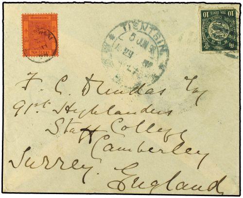 1898 Envelope to Camberley Staff College, franked 10c. ´Dragon´ cancelled bars with Tientsin "dollar" chop in association, + QV 10c. tied by Shanghai date stamp.