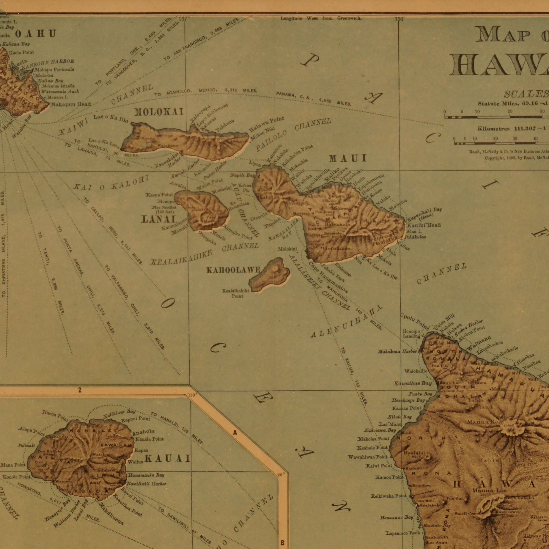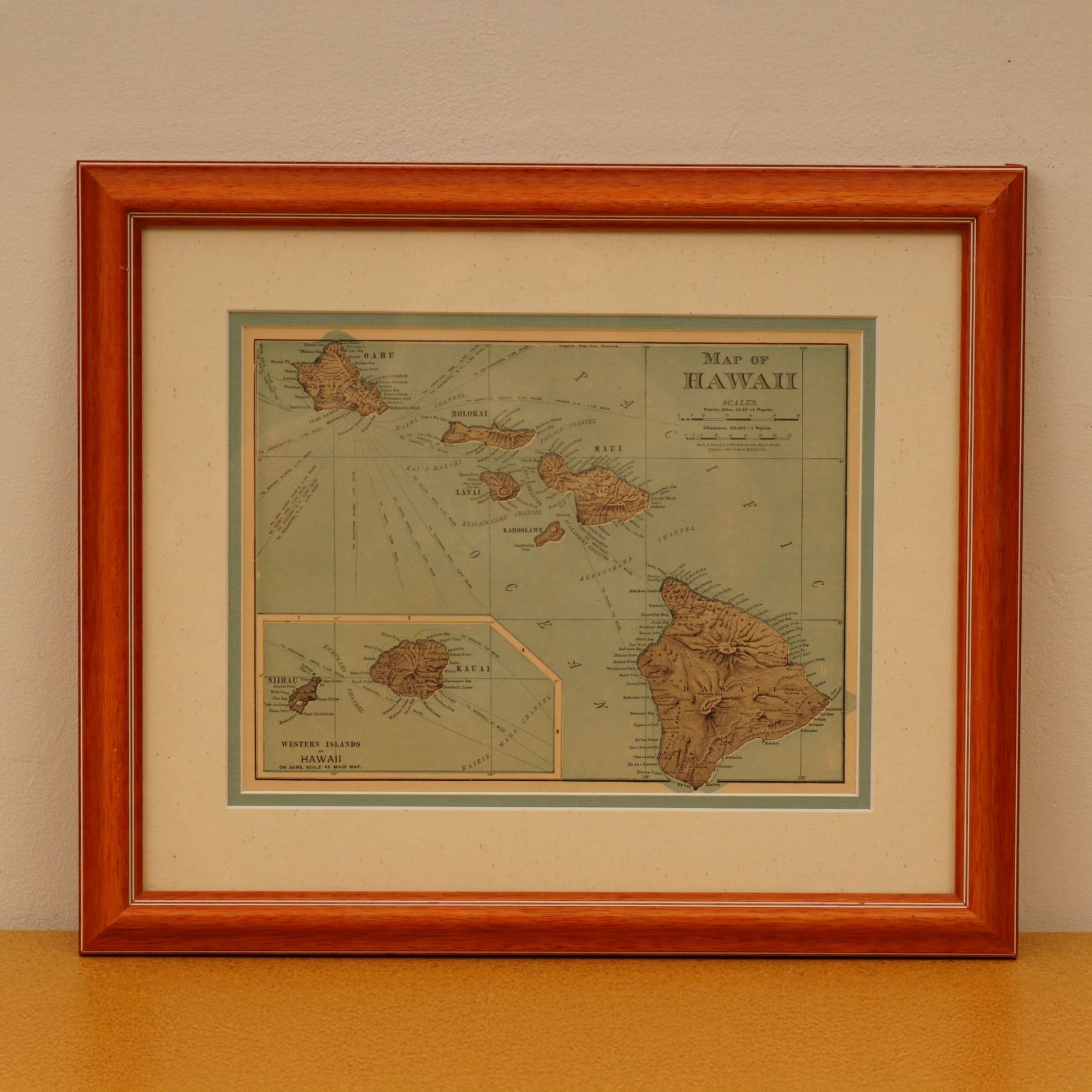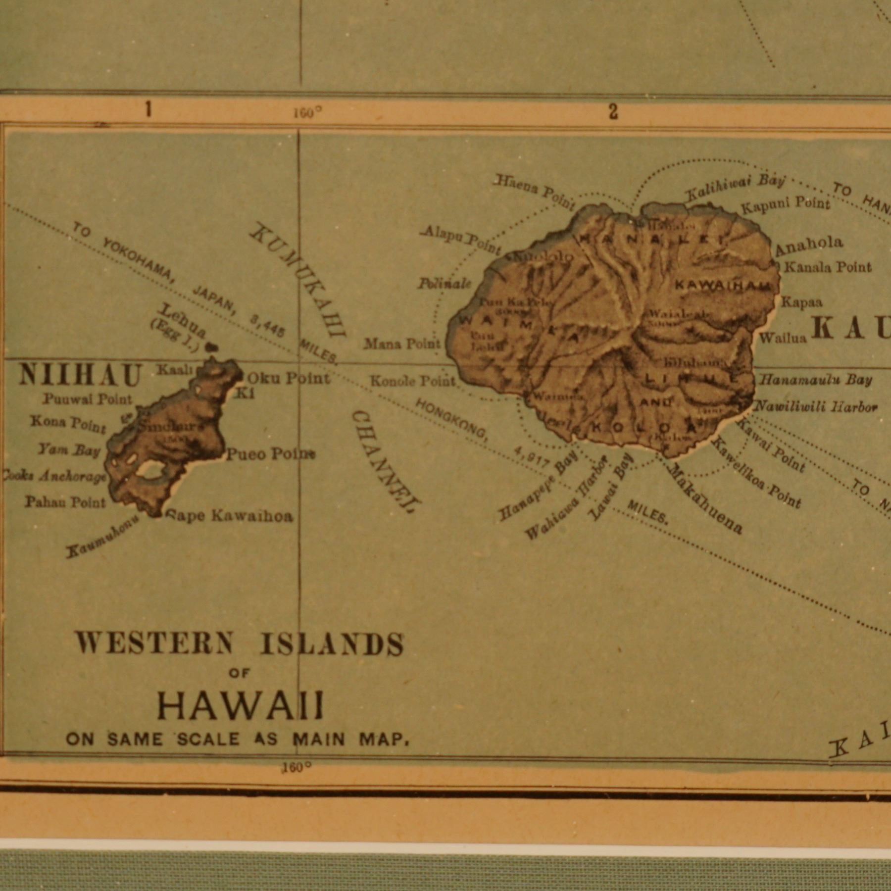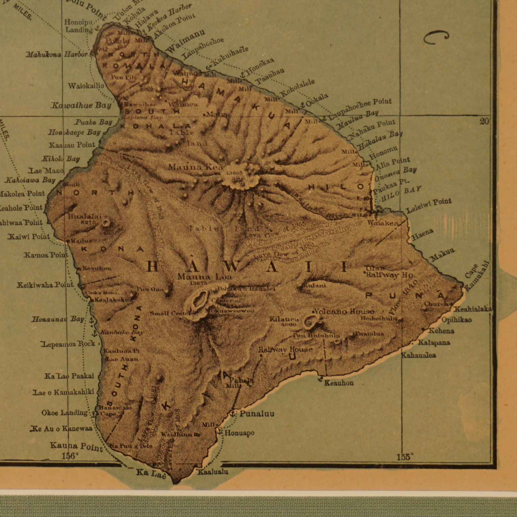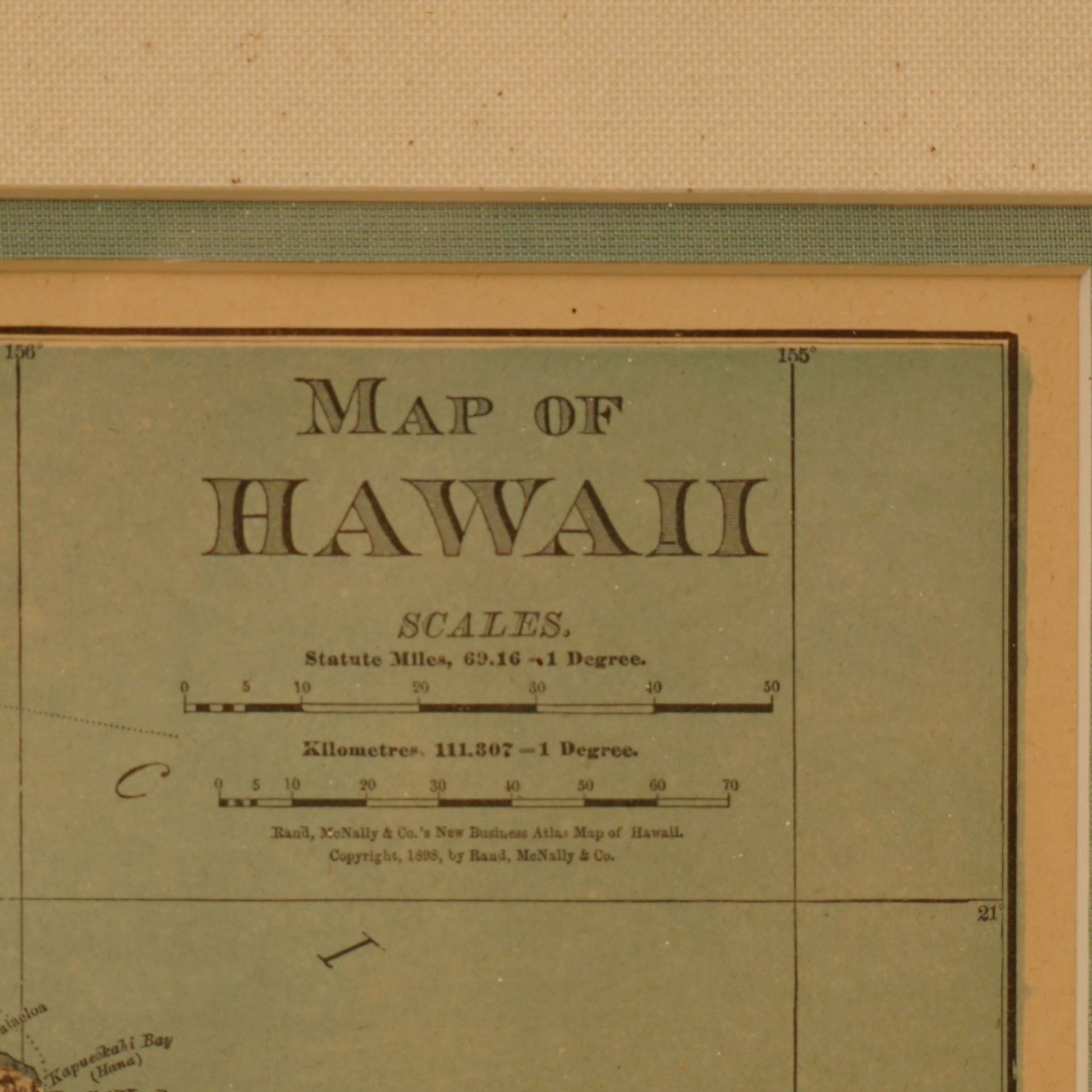 Beautifully framed antique map titled Map of Hawaii, published by Rand McNally & Co. in 1898. This finely detailed cartographic print depicts the Hawaiian Islands including Oahu, Maui, Kauai, Molokai, Lanai, and the Big Island, with an inset of the Western Islands of Niihau and Kauai. The map shows geographic features such as Mauna Kea, Mauna Loa, and major bays, along with early place names and distances to major ports. Presented under glass in a warm wooden frame with a double mat, this historic piece captures the spirit of late 19th-century exploration and the territorial era of Hawaii. A timeless display of geographic artistry and history.