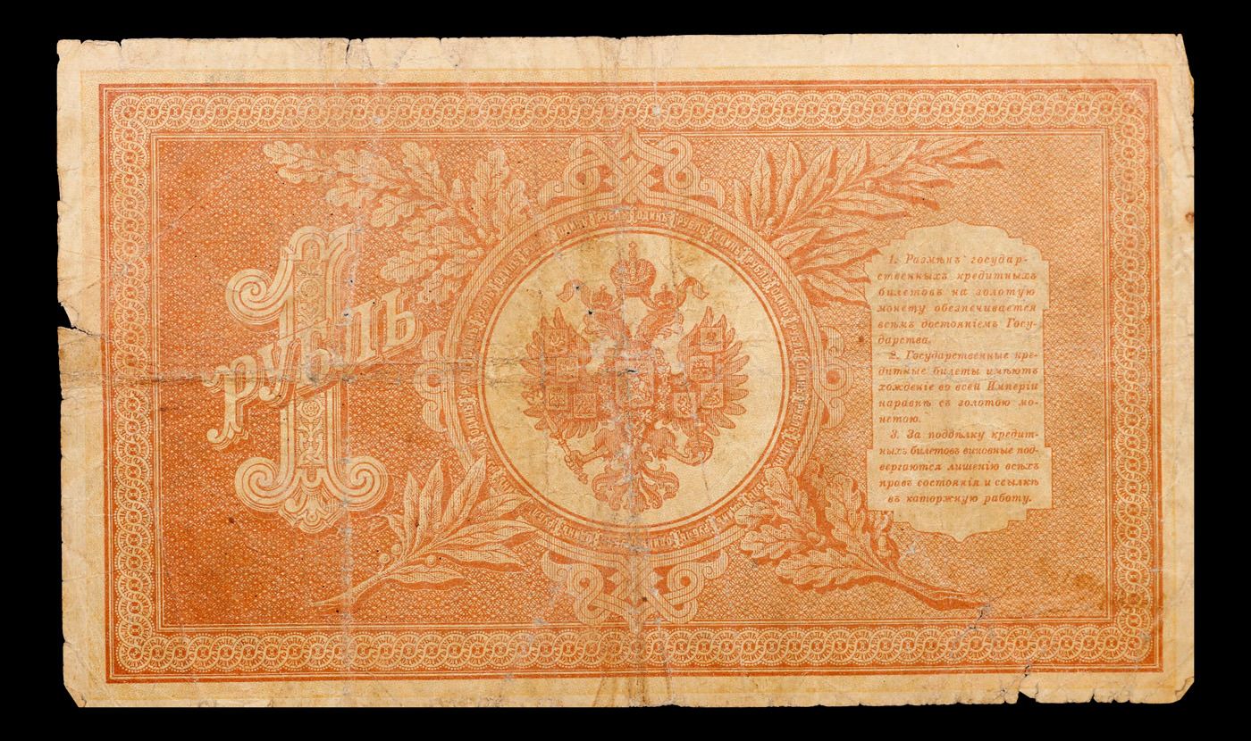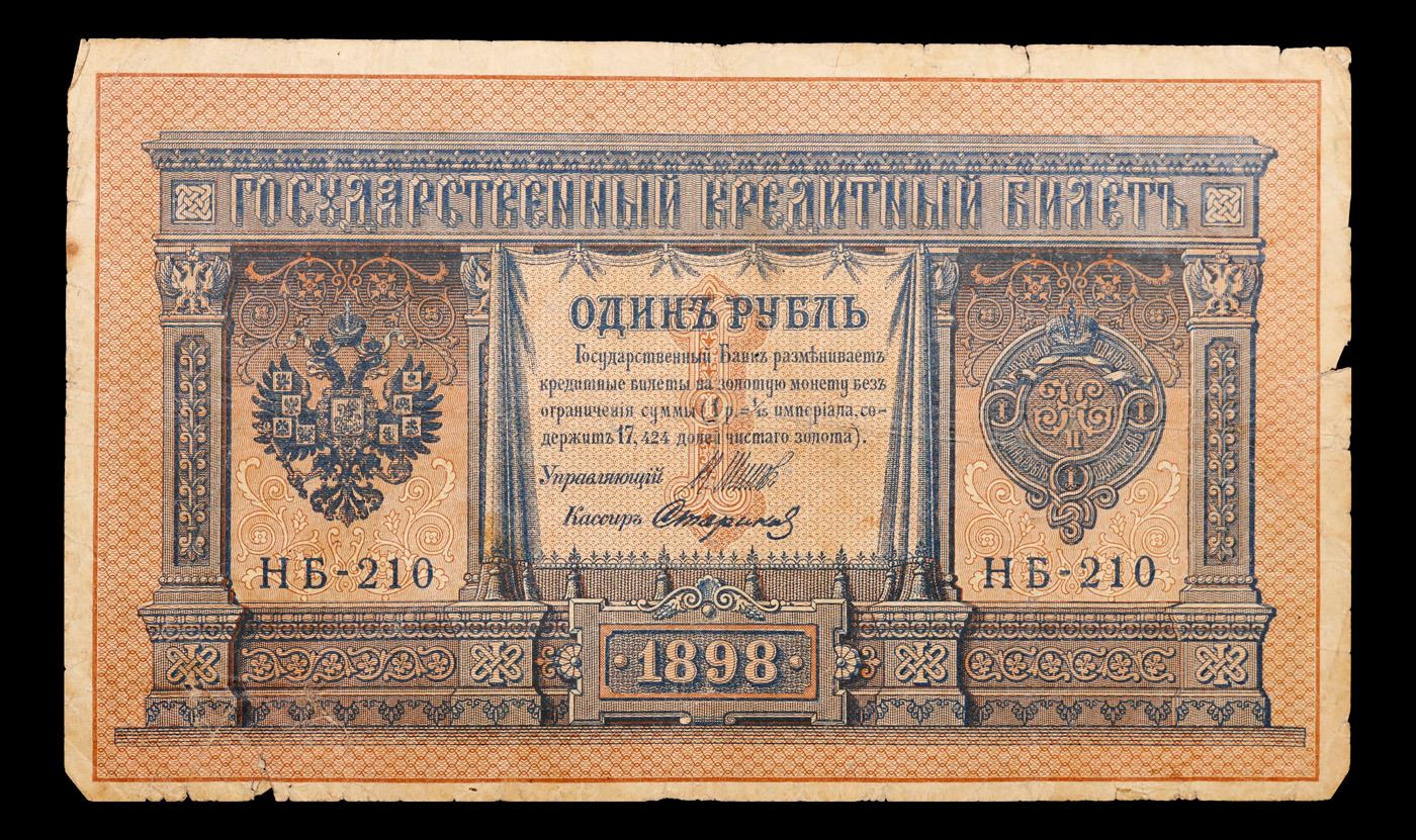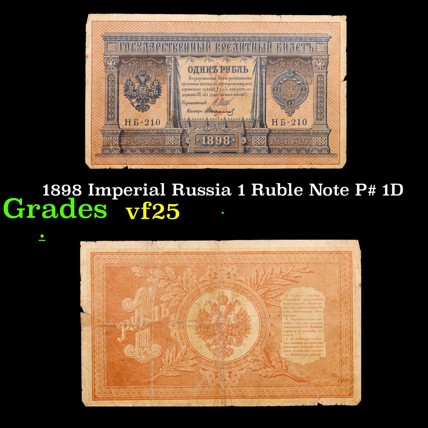 1898 Imperial Russia 1 Ruble Note P# 1D Grades vf+. Up for auction we have a beautiful, ornate Imperial Ruble note from the final decade of the Russian Empire under Tsar Nicholas II, which managed to survive through the Russian Revolution and Civil War. These notes became relatively useless in the early Soviet period, due to hyperinflation and other factors, and many were lost or destroyed.