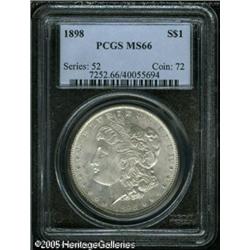 <B>1898<img border='0' src='http://www.heritagecoins.com/images/star.gif' width=10 height=10>$1 MS66 PCGS.</B></I> Sharply struck and fully brilliant with frosty white luster. The reverse fields are slightly reflective. Lot:10519