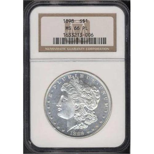<b>1898 Morgan Dollar. NGC graded MS66 PL.</b> This is a sparkling silver specimen radiating mint bloom with prooflike glitter in the fields, powerfully struck and impeccably preserved. This is a generally well-struck example with good details. It has no bothersome abrasions or points of wear but as is often the case, the dies left their partly rigid impression behind with some modest weakness or imprecision only at the centers <b>(PCGS # 7253)</b>