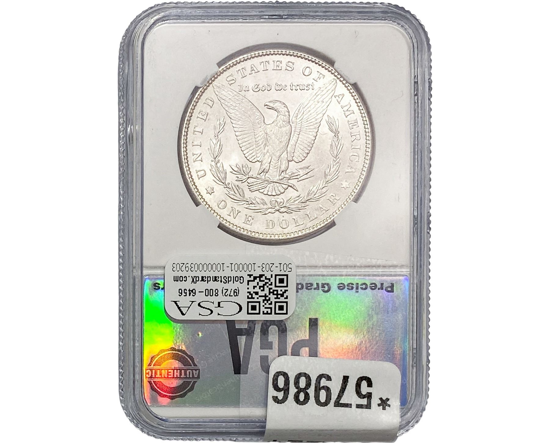 e. Coins sold referencing a third-party grading service are sold “AS IS” without any express or implied warranty, except for a guarantee by GSA that they are genuine. Removal or alteration of the holder, voids all of Bidder’s claims concerning that Product. Certain warranties may be available from the grading services and Bidders are referred to them for further details: Numismatic Guaranty Corporation (NGC), PO Box 4776, Sarasota, FL 34230, www.ngccoin.com/services/writtenguarantee.asp; Professional Coin Grading Services (PCGS), PO Box 9458, Newport Beach, CA 92658, www.pcgs.com/guarantee.html; ANACS, 6555 S. Kenton St., Ste. 303, Englewood, CO 80111; and Independent Coin Grading Co. (ICG), 7901 East Bellview, Ave., Suite 50, Englewood, CO 80111.
