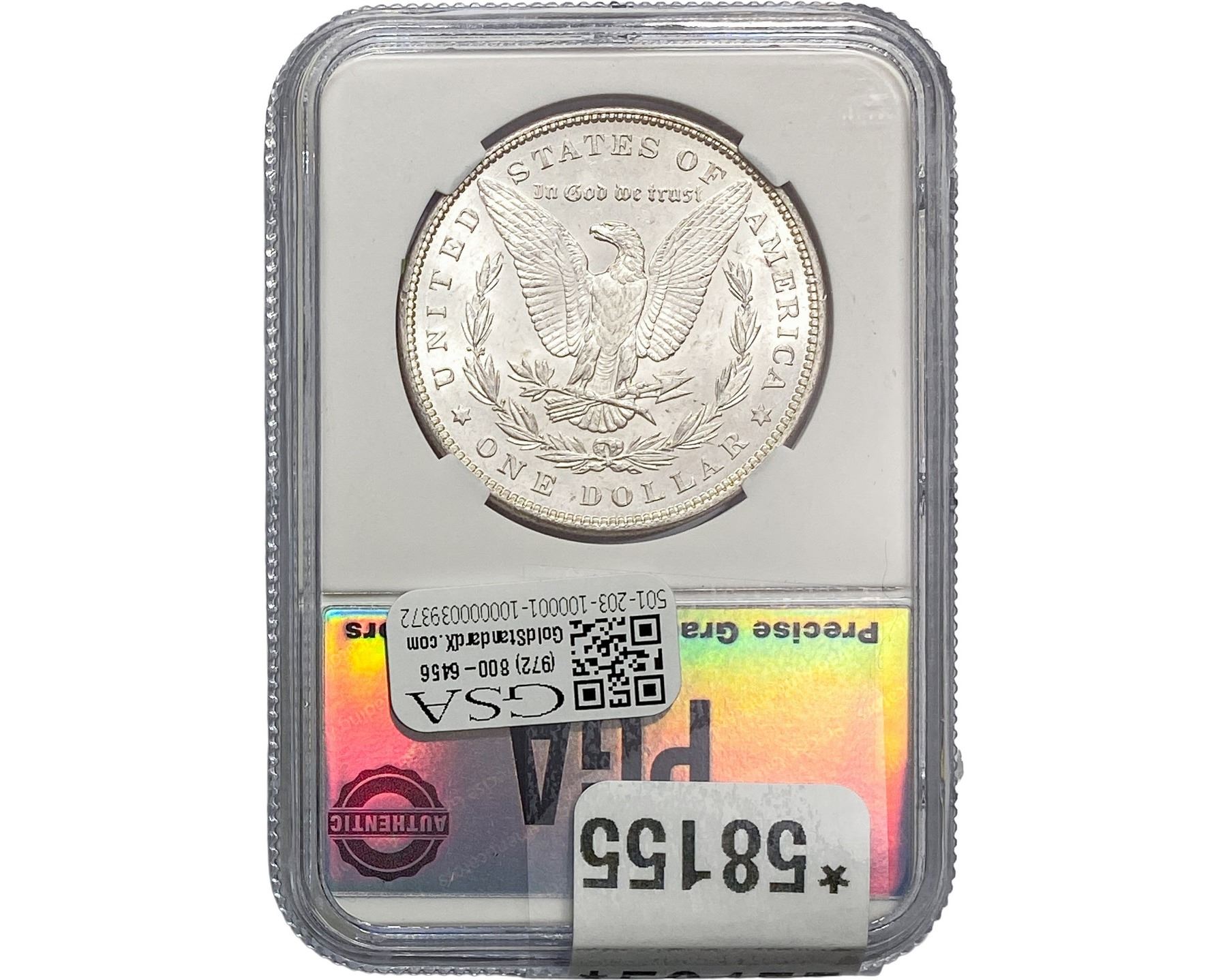 e. Coins sold referencing a third-party grading service are sold “AS IS” without any express or implied warranty, except for a guarantee by GSA that they are genuine. Removal or alteration of the holder, voids all of Bidder’s claims concerning that Product. Certain warranties may be available from the grading services and Bidders are referred to them for further details: Numismatic Guaranty Corporation (NGC), PO Box 4776, Sarasota, FL 34230, www.ngccoin.com/services/writtenguarantee.asp; Professional Coin Grading Services (PCGS), PO Box 9458, Newport Beach, CA 92658, www.pcgs.com/guarantee.html; ANACS, 6555 S. Kenton St., Ste. 303, Englewood, CO 80111; and Independent Coin Grading Co. (ICG), 7901 East Bellview, Ave., Suite 50, Englewood, CO 80111.
