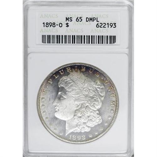 <B>1898-O $1 MS65 Deep Mirror Prooflike ANACS.</B></I> NGC Census: (59/16). PCGS Population (142/41). Numismedia Wsl. Price for NGC/PCGS coin in MS65: $825. (#97255)<BR><BR><b>Shipping:</b> Coins & Currency (<a target="_blank" href="http://www.heritageauctions.com/common/shipping.php">view shipping information</a>)