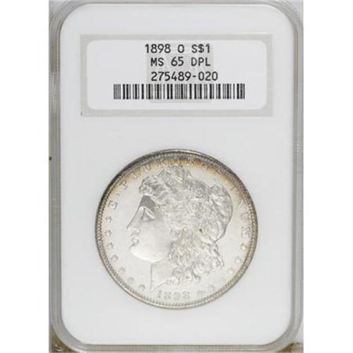 <B>1898-O $1 MS65 Deep Mirror Prooflike NGC.</B></I> NGC Census: (59/16). PCGS Population (142/41). Numismedia Wsl. Price for NGC/PCGS coin in MS65: $825. (#97255)<BR><BR><b>Shipping:</b> Coins & Currency (<a target="_blank" href="http://www.heritageauctions.com/common/shipping.php">view shipping information</a>)