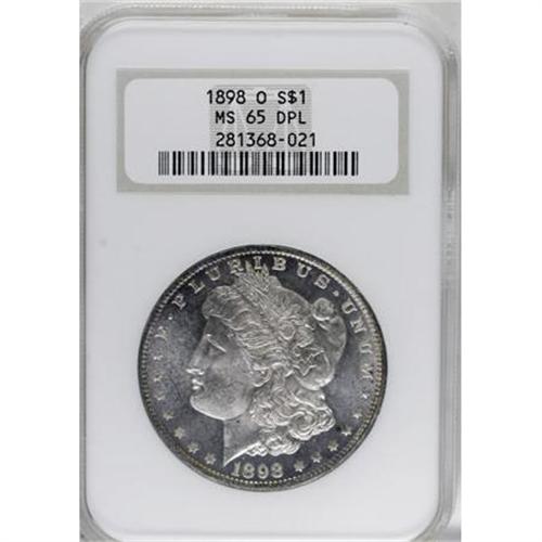 <B>1898-O $1 MS65 Deep Mirror Prooflike NGC.</B></I> Light rose and gold toning is largely confined to the margins. The reflective fields are only minimally abraded, and the devices are well preserved. A good strike for a New Orleans dollar from the 1890s. Certified in a prior generation holder.<BR><BR><b>Shipping:</b> Coins & Currency (<a target="_blank" href="http://www.heritageauctions.com/common/shipping.php">view shipping information</a>)