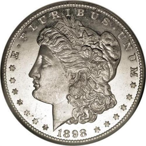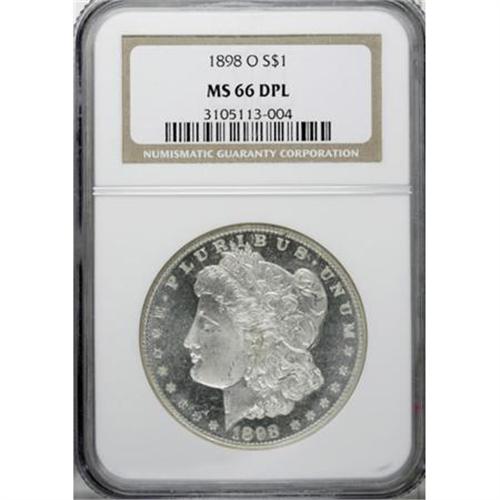 <B>1898-O $1 MS66 Deep Mirror Prooflike NGC.</B></I> Untoned surfaces display outstanding field-motif contrast, and are minimally abraded. A well executed strike leaves exquisite definition on the design elements. David Bowers (2006) estimates that perhaps 3 million or more of the 4.440 million-piece mintage were melted. Census: 16 in 66 Deep Mirror Prooflike, 1 finer (1/08).<BR><BR><b>Shipping:</b> Coins & Currency (<a target="_blank" href="http://www.heritageauctions.com/common/shipping.php">view shipping information</a>)