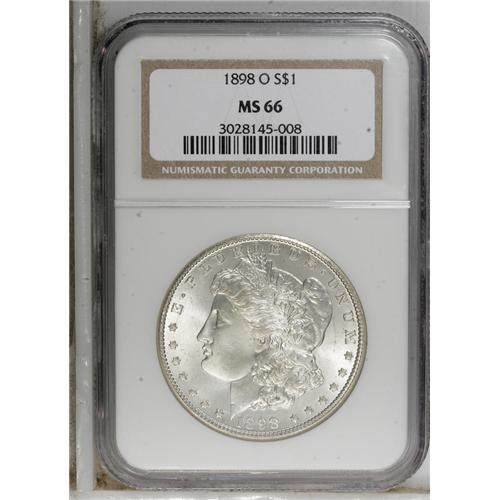 <B>1898-O $1 MS66 NGC.</B></I> NGC Census: (1493/119). PCGS Population (1494/126). Mintage: 4,440,000. Numismedia Wsl. Price for NGC/PCGS coin in MS66: $312. (#7254)<BR><BR><b>Shipping:</b> Coins & Currency (<a target="_blank" href="http://www.heritageauctions.com/common/shipping.php">view shipping information</a>)