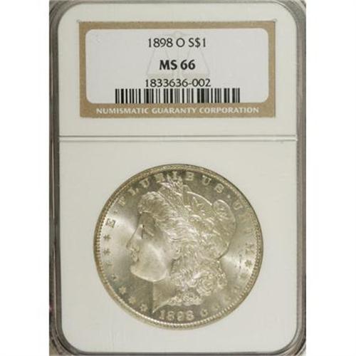 <B>1898-O $1 MS66 NGC.</B></I> NGC Census: (1496/119). PCGS Population (1493/126). Mintage: 4,440,000. Numismedia Wsl. Price for NGC/PCGS coin in MS66: $300. (#7254)<BR><BR><b>Shipping:</b> Coins & Currency (<a target="_blank" href="http://www.heritageauctions.com/common/shipping.php">view shipping information</a>)