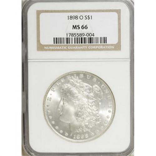 <B>1898-O $1 MS66 NGC.</B></I> . NGC Census: (1533/131). PCGS Population (1567/132). Mintage: 4,440,000. Numismedia Wsl. Price for NGC/PCGS coin in MS66: $300. (#7254)<BR><BR><B>Coin Engraver:</B> George T. Morgan<BR><BR><b>Shipping:</b> Coins & Currency (<a target="_blank" href="http://www.heritageauctions.com/common/shipping.php">view shipping information</a>)