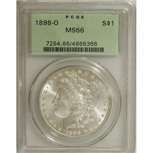 <B>1898-O $1 MS66 PCGS.</B></I> PCGS Population (1523/129). NGC Census: (1518/123). Mintage: 4,440,000. Numismedia Wsl. Price for NGC/PCGS coin in MS66: $300. (#7254)<BR><BR><B>Coin Engraver:</B> George T. Morgan<BR><BR><b>Shipping:</b> Coins & Currency (<a target="_blank" href="http://www.heritageauctions.com/common/shipping.php">view shipping information</a>)