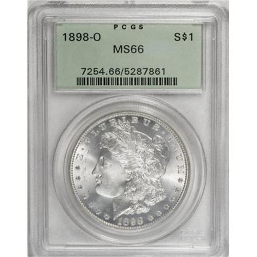 <B>1898-O $1 MS66 PCGS.</B></I> PCGS Population (1542/129). NGC Census: (1518/123). Mintage: 4,440,000. Numismedia Wsl. Price for NGC/PCGS coin in MS66: $300. (#7254)<BR><BR><B>Coin Engraver:</B> George T. Morgan<BR><BR><b>Shipping:</b> Coins & Currency (<a target="_blank" href="http://www.heritageauctions.com/common/shipping.php">view shipping information</a>)