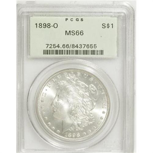 <B>1898-O $1 MS66 PCGS.</B></I> PCGS Population (1542/129). NGC Census: (1518/123). Mintage: 4,440,000. Numismedia Wsl. Price for NGC/PCGS coin in MS66: $300. (#7254)<BR><BR><B>Coin Engraver:</B> George T. Morgan<BR><BR><b>Shipping:</b> Coins & Currency (<a target="_blank" href="http://www.heritageauctions.com/common/shipping.php">view shipping information</a>)