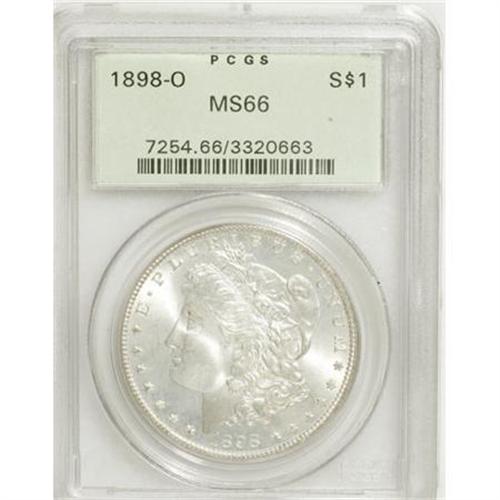 <B>1898-O $1 MS66 PCGS.</B></I> PCGS Population (1542/129). NGC Census: (1518/123). Mintage: 4,440,000. Numismedia Wsl. Price for NGC/PCGS coin in MS66: $300. (#7254)<BR><BR><B>Coin Engraver:</B> George T. Morgan<BR><BR><b>Shipping:</b> Coins & Currency (<a target="_blank" href="http://www.heritageauctions.com/common/shipping.php">view shipping information</a>)