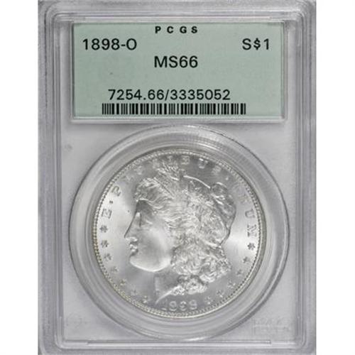 <B>1898-O $1 MS66 PCGS.</B></I> PCGS Population (1542/129). NGC Census: (1518/123). Mintage: 4,440,000. Numismedia Wsl. Price for NGC/PCGS coin in MS66: $300. (#7254)<BR><BR><B>Coin Engraver:</B> George T. Morgan<BR><BR><b>Shipping:</b> Coins & Currency (<a target="_blank" href="http://www.heritageauctions.com/common/shipping.php">view shipping information</a>)