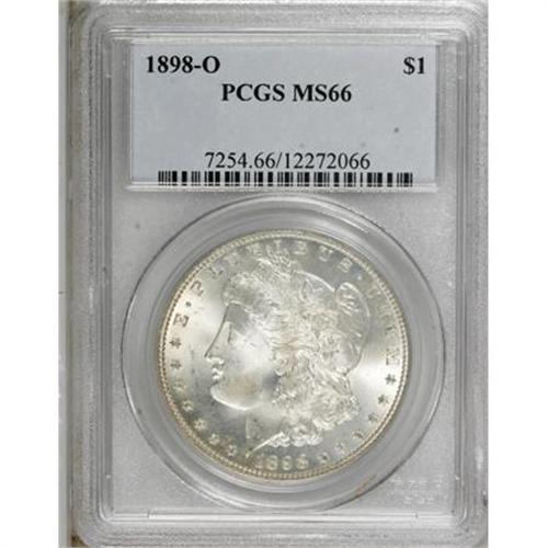 <B>1898-O $1 MS66 PCGS.</B></I> . PCGS Population (1567/132). NGC Census: (1540/133). Mintage: 4,440,000. Numismedia Wsl. Price for NGC/PCGS coin in MS66: $300. (#7254)<BR><BR><B>Coin Engraver:</B> George T. Morgan<BR><BR><b>Shipping:</b> Coins & Currency (<a target="_blank" href="http://www.heritageauctions.com/common/shipping.php">view shipping information</a>)