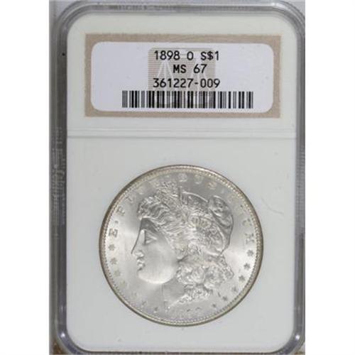 <B>1898-O $1 MS67 NGC.</B></I> Thoroughly lustrous with a crisp strike. Devoid of both toning and marks with a freshness that reinforces this piece's Superb Gem status. An outstanding example from this available O-mint Morgan dollar issue. NGC has graded just one numerically finer piece (8/07).<BR><BR><B>Coin Engraver:</B> George T. Morgan<BR><BR><b>Shipping:</b> Coins & Currency (<a target="_blank" href="http://www.heritageauctions.com/common/shipping.php">view shipping information</a>)