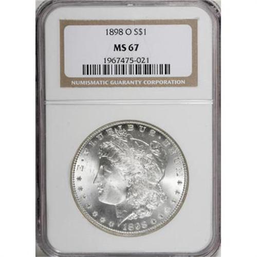 <B>1898-O $1 MS67 NGC.</B></I> This practically brilliant Superb Gem has potent luster and gorgeous preservation. A bold strike with only minor inexactness above Liberty's ear and on the eagle's breast.<BR><BR><B>Coin Engraver:</B> George T. Morgan<BR><BR><b>Shipping:</b> Coins & Currency (<a target="_blank" href="http://www.heritageauctions.com/common/shipping.php">view shipping information</a>)