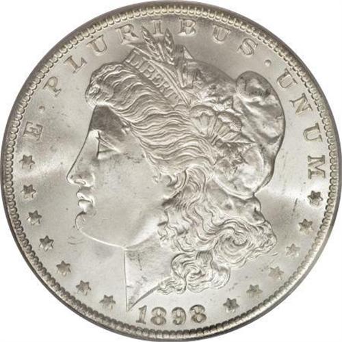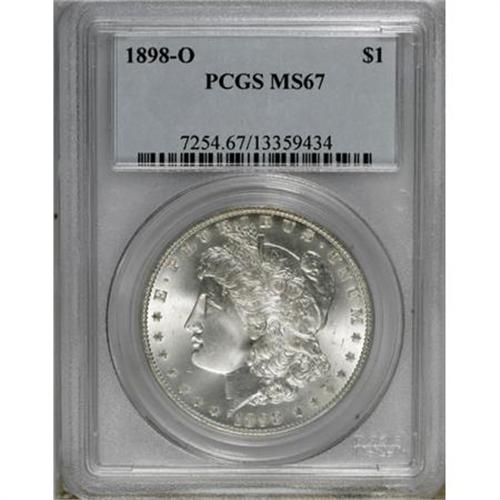 <B>1898-O $1 MS67 PCGS.</B></I> The snow-white surfaces are intensely lustrous and amazingly clean on both sides. Liberty's cheek and the eagle's breast are virtually pristine. Sharply struck on all of the design elements, and lacking any of the central weakness that is frequently seen on Morgan dollars from the New Orleans Mint. PCGS has not graded any example finer, as of (2/08). <BR><BR><B>Coin Engraver:</B> George T. Morgan<BR><BR><b>Shipping:</b> Coins & Currency (<a target="_blank" href="http://www.heritageauctions.com/common/shipping.php">view shipping information</a>)