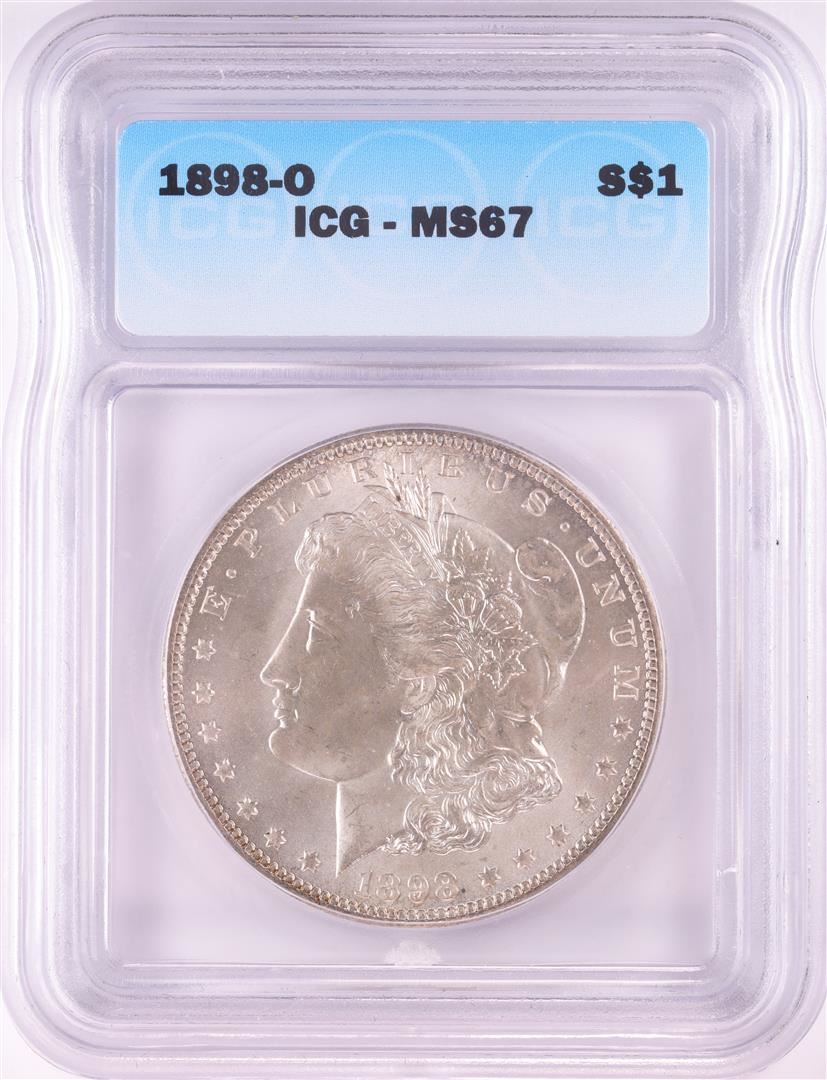 One 1898-O $1 Morgan Silver Dollar Coin ICG MS67. ICG Certified.