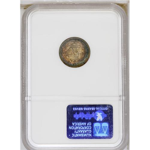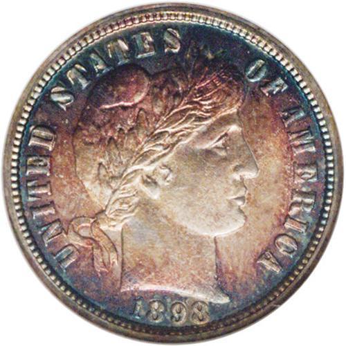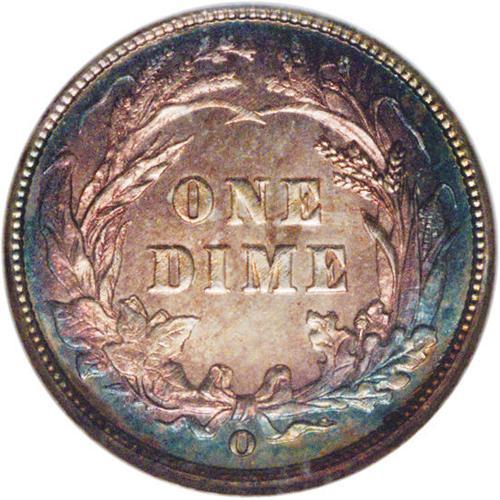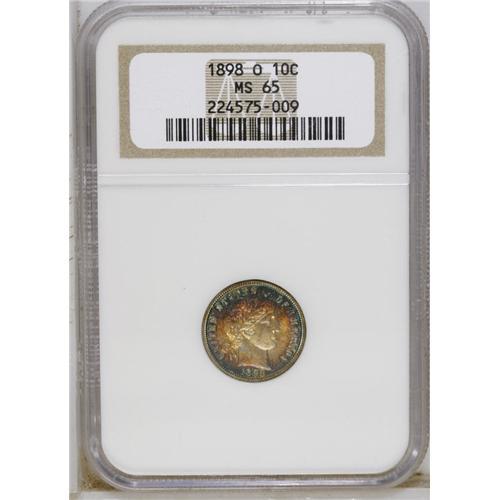 <B>1898-O 10C MS65 NGC.</B></I> This beautiful coin displays lightly toned champagne-gray centers within intense orange-russet and electric-blue peripheral toning. The distraction-free surfaces are undeniably of Gem quality. Peripheral roller marks are of mint origin, and seldom affect the sharpness of the devices. Among the most attractive 1898-O dimes that we have ever offered, we wholeheartedly endorse this coin for both its technical quality and its captivating eye appeal. Census: 10 in 65, 3 finer (11/06).<BR><BR><b>Shipping:</b> Coin/Currency (<a target="_blank" href="http://www.heritageauctions.com/common/shipping.php">view shipping information</a>)