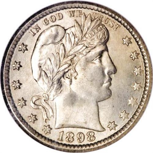 <B>1898-O 25C MS65 NGC.</B></I> Similar to the New Orleans dime of the same year, the 1898-O quarter is rare simply because few were saved at the time of issue. This piece offers lustrous, frosty gold-tinged silver surfaces with excellent eye appeal. The strike is nearly full (showing as weakness only on the eagle's right [facing] claw) and quite extraordinary for a O-mint coin of the era. Grab this one before it gets away! Census: 3 in 65, 4 finer (1/08).<BR><I>From The Southwest Collection.</B></I><BR><BR><B>Coin Engraver:</B> Charles E. Barber<BR><BR><b>Shipping:</b> Coins & Currency (<a target="_blank" href="http://www.heritageauctions.com/common/shipping.php">view shipping information</a>)