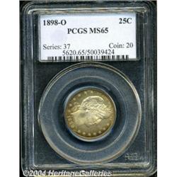 <B>1898-O<25C> MS65 PCGS.</B></I> The 1898-O is one of the scarcest dates in the series in VF and higher grades. In Mint State it is ranked as third scarcest in the series. High grade examples such as this one are very rare and seldom encountered. The surfaces are bright overall with a strong semi-prooflike glimmer in the fields. The centers are almost untoned but the margins are encircled by deep golden-russet and cobalt-blue toning. The obverse is very sharply struck with just the slightest hint of weakness evident over the highpoints of the reverse. A superlative example of this rare issue. Population: 5 in 65, 2 finer (3/04).<BR><I>Ex: Central States Signature Sale (Heritage, 5/03), lot 6167, which realized $8,337.50.</B></I><BR><I>From the JFS Collection.</B></I> <BR><BR><B>Important notice:</B> Heritage usually auctions material at the rate of 200-250 lots per hour. On some occasions eBay Live bid software or the Internet may not be able to keep up with the pace of the auction. We recommend placing a realistic absentee bid now as insurance to avoid disappointment. Occasionally the auctioneer may eliminate or reject an eBay Live bid, and the auctioneer may also reopen a lot after the close of the eBay live bidding (usually because we missed an audience bid), and may reject your bid even if it shows you as the winning bidder. By bidding via eBay Live, you agree that Heritage may award the lot to another bidder at its sole discretion under the circumstances described above or any other reasonable circumstances. Since eBay bids are not shown to us until we open the lot on the floor, we treat those bids just like floor bids. In most cases the floor responds before the eBay bid is presented to us, due to Internet lag time, so for consistency we have made it a policy that floor bids are always considered first over tie eBay live bids. Also please note that all Heritage lots purchased through eBay Live carry a 20% Buyer's Premium. Please make sure you read the Terms and Conditions before you bid. </span></font></tr></table></td></tr></table>