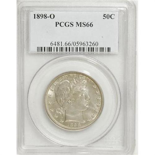 <B>1898-O 50C MS66 PCGS.</B></I> One of the scarce and underrated issues in the Barber half series, the 1898-O is usually found in low grades and poorly struck. This coin, of course, is neither. It is one of the finest examples of this semi-key issue we have encountered. The last MS66 we offered was the Price coin in June 2005. <BR> The typical 1898-O is Good-Very Good, even Fine-AU coins are scarce and always worth a premium. At the MS66 level, this is one of only three pieces certified by PCGS with one finer (10/07). NGC has only graded two coins with one finer. The surfaces are brilliant throughout with flashy, satin-like mint luster. The fields display the often-encountered semi-prooflikeness, but here it is on both sides rather than one side as usually seen. The obverse is fully struck, and it is only on the reverse that any trace of softness is noted. An exemplary 1898-O for the collector of this popular series.<BR><BR><B>Coin Engraver:</B> Charles E. Barber<BR><BR><b>Shipping:</b> Coins & Currency (<a target="_blank" href="http://www.heritageauctions.com/common/shipping.php">view shipping information</a>)
