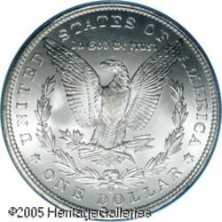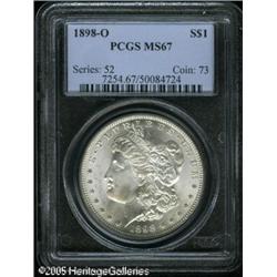 <B>1898-O<img border='0' src='http://www.heritagecoins.com/images/star.gif' width=10 height=10>$1 MS67 PCGS.</B></I> A substantial percentage of the mintage of 4.44 million coins struck of the 1898-O dollar was apparently set aside and eventually distributed through the Federal Reserve System in late 1962. Few, however, show the amazingly well preserved surfaces seen on this piece. Brilliant throughout, the cheek of Liberty is smooth and silky and there are virtually no abrasions on either side. Fully struck also, this is a memorable example of this uncommonly nice common date in the late Morgan series. Population: 102 in 67, 0 finer (1/05).<BR><I>From The Banks Collection.</B></I> Lot:10533