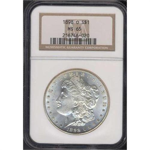 <b>1898-O Morgan Dollar. NGC graded MS65.</b> The silvery hue alternates between levels of frost and satin-texture with Liberty's cheek much nicer than average. Lustrous and well struck <b>(PCGS # 7254)</b>