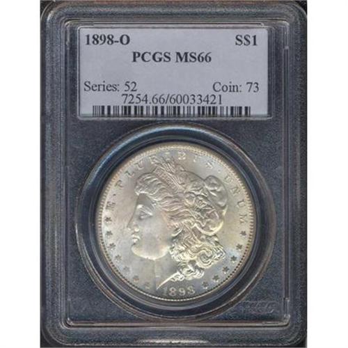 <b>1898-O Morgan Dollar. PCGS graded MS66.</b> Lustrous with deep white frostiness that dominates the surfaces of this beautiful coin, including a particular glow to the reverse fields. Both the peripheries as well as the central reverse are impressive for their sharpness of strike, and the frosty textured surfaces are near pristine quality <b>(PCGS # 7254)</b>