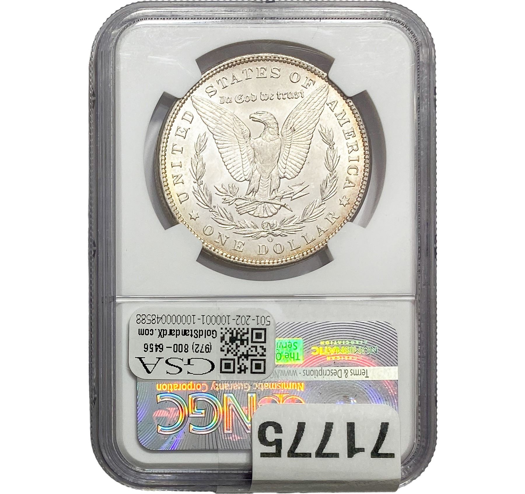 e. Coins sold referencing a third-party grading service are sold “AS IS” without any express or implied warranty, except for a guarantee by GSA that they are genuine. Removal or alteration of the holder, voids all of Bidder’s claims concerning that Product. Certain warranties may be available from the grading services and Bidders are referred to them for further details: Numismatic Guaranty Corporation (NGC), PO Box 4776, Sarasota, FL 34230, www.ngccoin.com/services/writtenguarantee.asp; Professional Coin Grading Services (PCGS), PO Box 9458, Newport Beach, CA 92658, www.pcgs.com/guarantee.html; ANACS, 6555 S. Kenton St., Ste. 303, Englewood, CO 80111; and Independent Coin Grading Co. (ICG), 7901 East Bellview, Ave., Suite 50, Englewood, CO 80111.