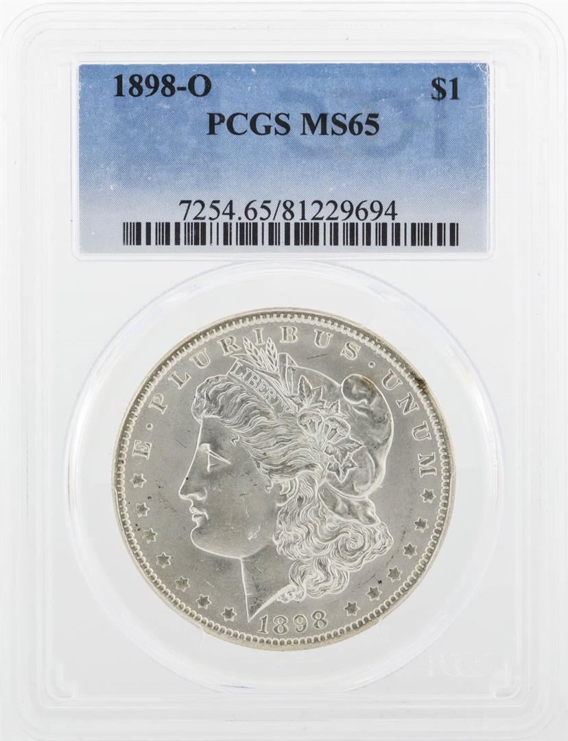 One 1898-O PCGS MS65 Morgan Silver Dollar.