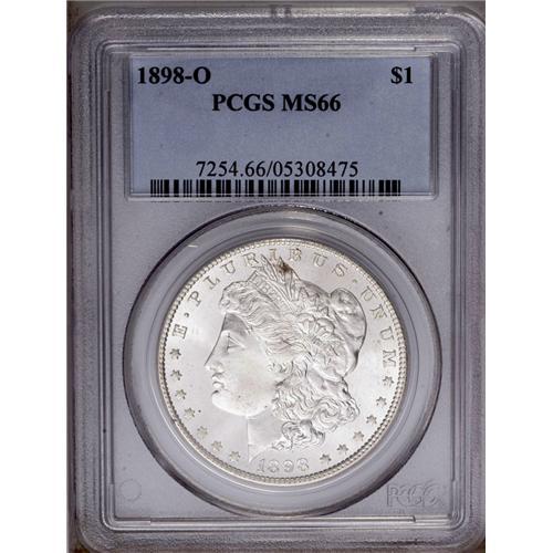 <B>1898-O<img border='0' src='http://www.heritagecoins.com/images/star.gif' width=10 height=10>$1> MS66 PCGS.</B></I> A spot of red toning appears at 12 o'clock on the obverse of this otherwise brilliant coin. A touch of softness appears in the hair above Liberty's ear, but this is minor and typical.