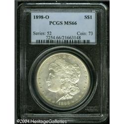 1898-O S$1 MS66 PCGS. A whisper or two of faint ta <B>1898-O S$1 MS66 PCGS.</B></I> A whisper or two of faint tan color adheres to lustrous surfaces that are virtually unabraded. Sharply struck, except for softness in the hair above Liberty's ear. <BR><BR><B>Important notice:</B> Heritage usually auctions material at the rate of 200-250 lots per hour. On some occasions eBay Live bid software or the Internet may not be able to keep up with the pace of the auction. We recommend placing a realistic absentee bid now as insurance to avoid disappointment. Occasionally the auctioneer may eliminate or reject an eBay Live bid, and the auctioneer may also reopen a lot after the close of the eBay live bidding (usually because we missed an audience bid), and may reject your bid even if it shows you as the winning bidder. By bidding via eBay Live, you agree that Heritage may award the lot to another bidder at its sole discretion under the circumstances described above or any other reasonable circumstances. Since eBay bids are not shown to us until we open the lot on the floor, we treat those bids just like floor bids. In most cases the floor responds before the eBay bid is presented to us, due to Internet lag time, so for consistency we have made it a policy that floor bids are always considered first over tie eBay live bids. Also please note that all Heritage lots purchased through eBay Live carry a 20% Buyer's Premium. Please make sure you read the Terms and Conditions before you bid. This lot is being auctioned in conjunction with a live floor auction by Heritage Galleries & Auctioneers. All final auction and invoice information will be supplied by Heritage Galleries & Auctioneers, and all other information should be considered preliminary. Lot:7700