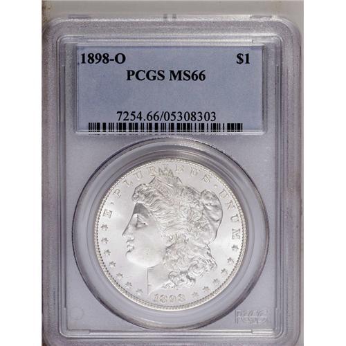 <B>1898-O<img border='0' src='http://www.heritagecoins.com/images/star.gif' width=10 height=10>$1> MS66 PCGS.</B></I> Liberty's cheek has a hint of gold toning, but this highly lustrous and magnificently preserved Premium Gem is otherwise brilliant. The strike is slightly incomplete on the claws and the hair above the ear.