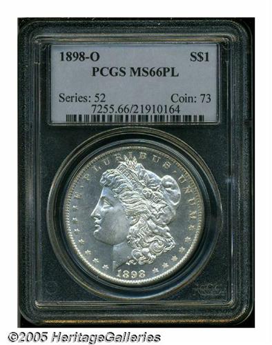 <B>1898-O<S$1> MS66 Prooflike PCGS.</B></I> This well struck Silver Dollar has frosty devices and good reflectivity in the fields. The obverse is nearly immaculate; a mark above the eagle's head decides the grade.