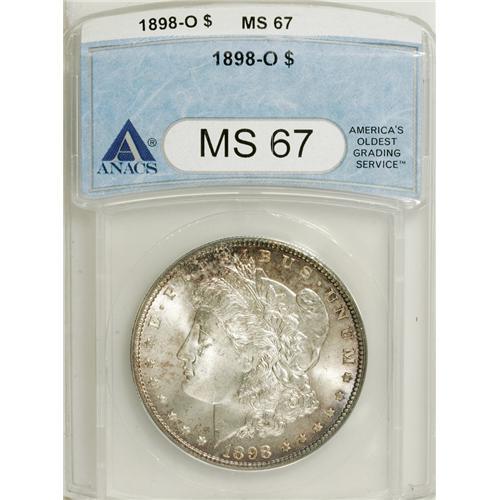 <B>1898-O S$1 MS67 ANACS.</B></I> Light to medium plum-red toning enriches this attractively preserved New Orleans silver dollar. The strike is crisp save for incompleteness on the hair above the ear.<BR><BR><b>Shipping:</b> Coins & Currency (<a target="_blank" href="http://www.heritageauctions.com/common/shipping.php">view shipping information</a>)